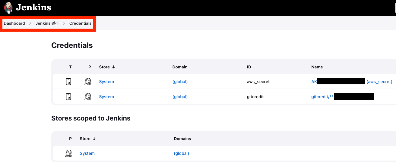 'Dashboard -> Jenkins 관리 -> Credentials'에서 등록되어있는 목록을 볼 수 있습니다.