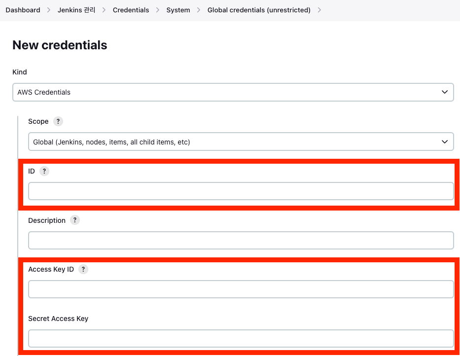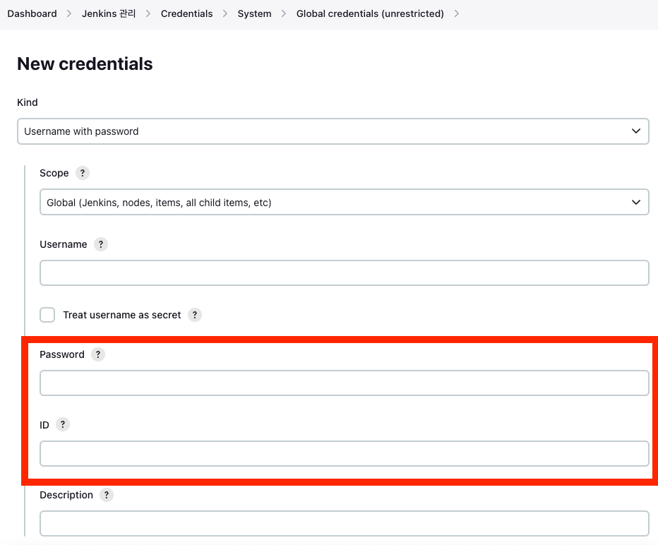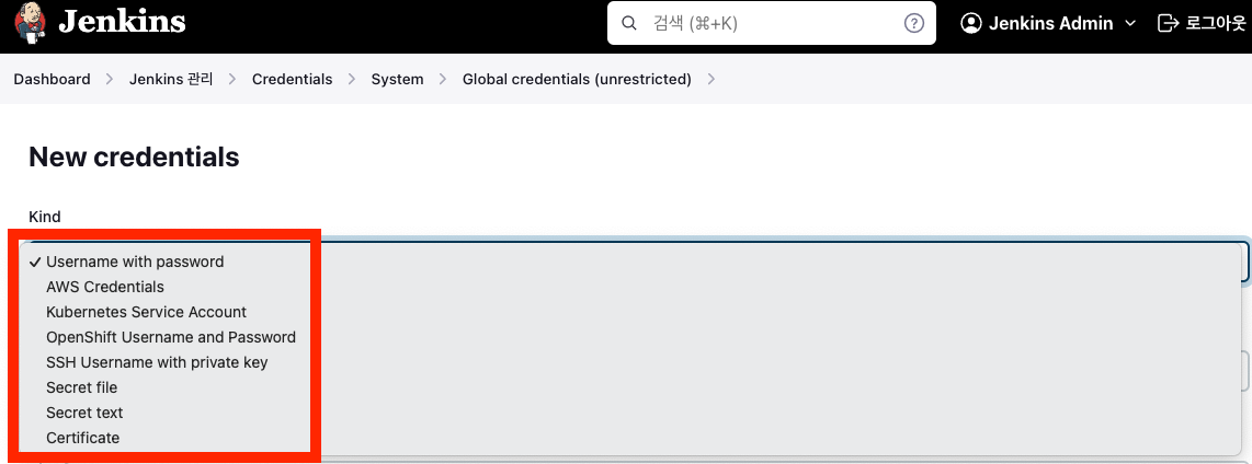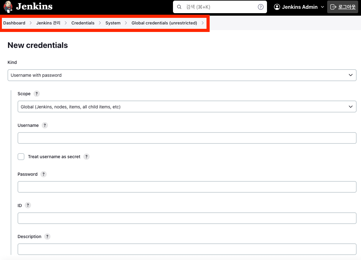 'Dashboard -> Jenkins 관리 -> Credentials -> System -> Global credentials -> Add credentials'