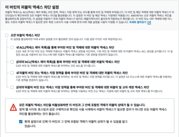 버킷에 퍼블릭으로 접근하기 위해서는 차단 설정을 해제하고 버킷 생성